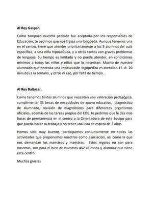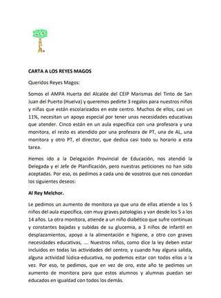 El centro recibirá el próximo viernes a los Reyes Magos y el AMPA les entregará esta significativa carta. Esperan captar la atención de la administración competente con este curioso gesto porque, dicen, "necesitan solucionar cuanto antes un problema que cada vez se va haciendo más grande y que afecta a gran parte de la comunidad educativa".