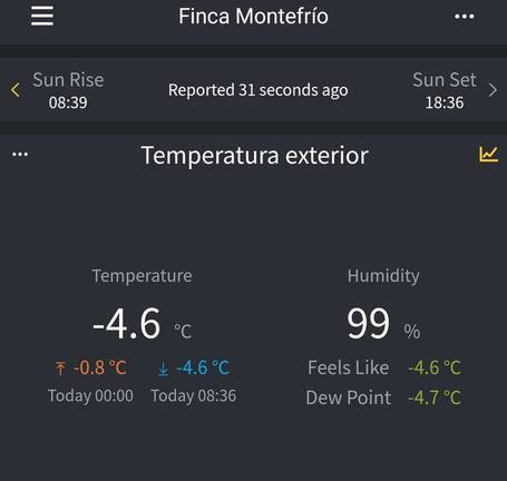 No obstante, la estación que MeteoHuelva tiene instalada cerca de Cortegana (Finca Montefrío) ha registrado hoy mismo una temperatura mínima de -4,6 °C. Es un registro muy destacable y bruto para una provincia como #Huelva y sobre todo sin tener ninguna ola de frío actualmente.