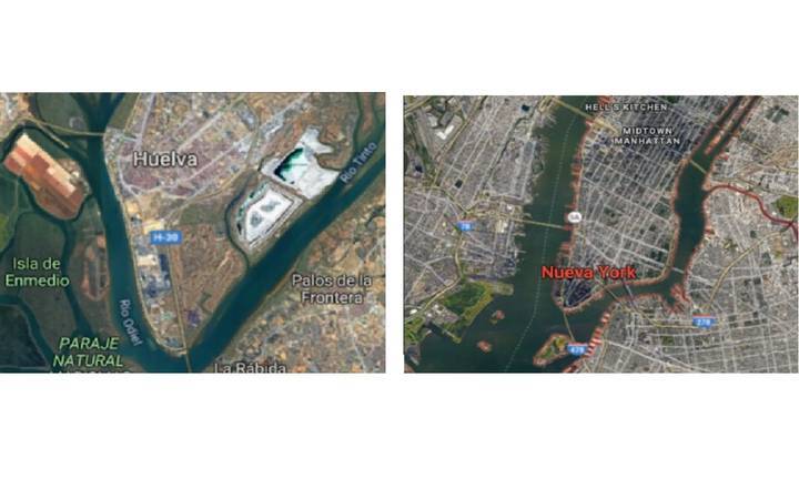 - Para empezar, ambas ciudades se ubican en la confluencia entre dos rías que se abren al mar. Nueva York, entre el Hudson y el Este. Huelva, entre el Tinto y el Odiel. La imagen aérea no deja lugar a dudas.