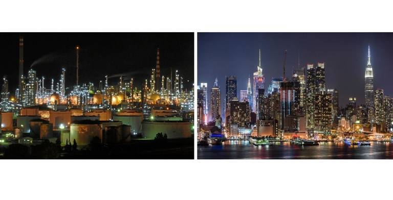 - Cuando cae la noche, el denso polo químico de Huelva ofrece un espectáculo de luz con sus múltiples y complejas instalaciones que reproducen la noche estrellada de los rascacielos de Nueva York.