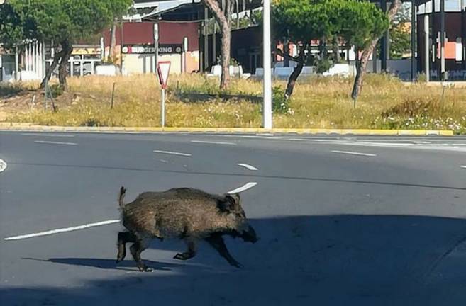 Acuden en busca de comida o animados simplemente por los paisajes desiertos. Es el caso de un jabalí que ha podido verse paseando tranquilamente estos días por el casco urbano de Punta Umbría, concretamente ha sido grabado en las inmediaciones del cementerio, una estampa difícil de ver cuando la actividad humana con la esperada 'nueva normalidad'.
