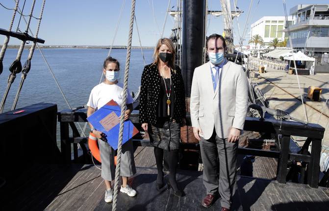 La presidenta del Puerto de Huelva, Pilar Miranda, acompañada por el jefe de Explotación del Puerto de Huelva, Abelardo Budía, ha visitado esta réplica del navío que hace cinco siglos capitaneado por Magallanes y Elcano protagonizó la mayor aventura marítima de todos los tiempos.