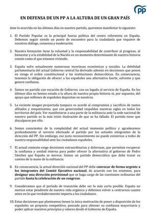 Acto seguido desde algunos sectores del PP de Huelva se han puesto manos a la obra y han repartido un decálogo, de momento sin firma, en el que apuestan porque la Dirección Nacional convoque al comité ejecutivo nacional para designar una dirección provisional que se haga cargo de las cuestiones ordinarias del partido hasta la celebración del congreso.