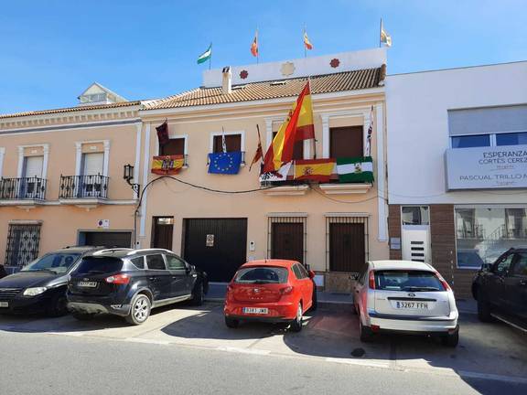 Entre más de una decena de banderas que lucen por toda la fachada e incluso en mástiles improvisado en la azotea, esta peculiar exaltación franquista mezcla las banderas de Andalucía, España y Europa con la del Águila de San Juan.