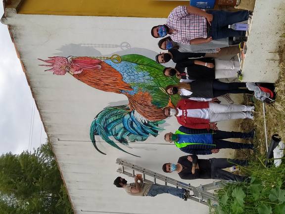 “Lucha por la paz”, título de la obra, está representado por un espectacular y colorido gallo que sujeta un colgante con el símbolo de la paz. Esta obra nos recuerda a todos la necesidad de luchar colectivamente por la “Paz, justicia e instituciones sólidas”, uno de los 17 Objetivos de Desarrollo Sostenible (ODS), al mismo tiempo que reivindica y pone de relieve la vida rural a través de uno de sus símbolos más conocidos, el gallo. Un gallo que durante muchos años ha tenido el papel de “despertador natural” en el mundo rural y que aquí además pretende despertar conciencias.