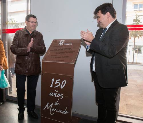 El alcalde de Huelva, Gabriel Cruz, ha presidido, junto al nuevo presidente de la Asociación de Detallistas, Plácido Carrascal, el acto organizado para celebrar el 150 aniversario del Mercado del Carmen. Arropado por distintas autoridades y un numeroso grupo de ciudadanos, se ha descubierto, al ritmo de los sones brindados por la Banda Municipal de Huelva, un monolito en conmemoración de la efemérides, ubicado en la calle Orégano del mercado.