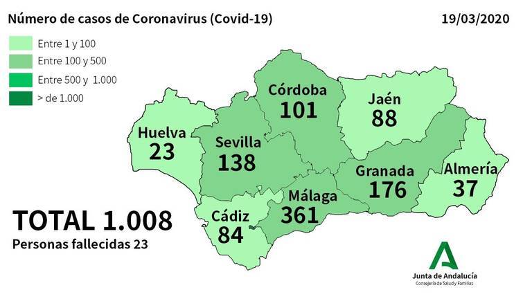 La Consejería de Salud y Familias informa que se han confirmado en Andalucía 149 nuevos casos de Coronavirus en las últimas horas. Así, el número total de afectados en Andalucía asciende a 1008. Del total, 307 están ingresados en hospitales (25 en la UCI).
