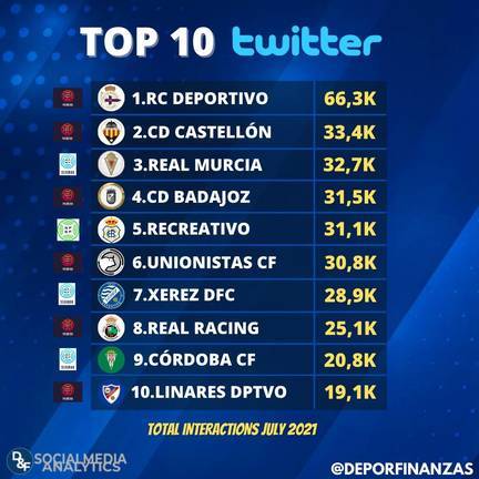 Así lo demuestra un estudio de la cuenta @DeporFinanzas, que recoge el total de interacciones realizadas en 'twitter' por los clubes de las tres categorías de la Real Federación Española de Fútbol durante el pasado mes de julio. En esta hipotética clasificación, el Recre ocuparía el quinto lugar, superado sólo por el Deportivo de La Coruña, Castellón, Murcia y Badajoz.