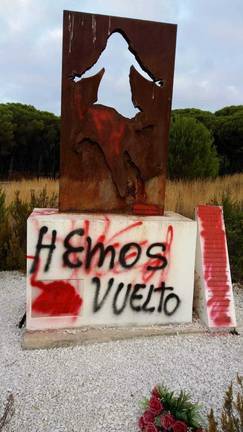 El monumento que el pueblo de Aljaraque erigió en 2010 en recuerdo de las decenas de víctimas que causó la represión franquista en la localidad ha amanecido hoy dañado y con pintadas. La escultura, ubicada en el paraje de Las Sordas, ha sido rociada con pintura e inscripciones donde se hacen alusiones al Valle de los Caídos, a la dictadura franquista y a la vuelta de los golpistas.