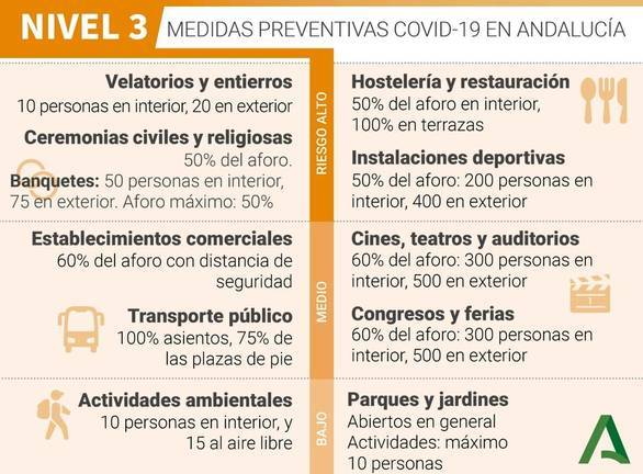 Además continúa la limitación de 4 personas en reuniones, tanto en el ámbito como en bares y restaurantes, y el cierre perimetral de las ocho provincias y de la Comunidad Autónoma de Andalucía.