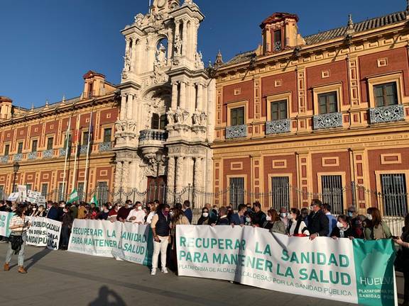 La Plataforma por la Sanidad Pública de Huelva (PSPH) se ha concentrado en las puertas del Palacio de San Telmo, sede del Gobierno de la Junta de Andalucía, para protestar y alzar la voz por la situación crítica que sufre la sanidad en la provincia onubense.
