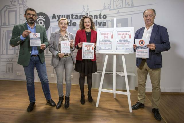 La concejala de Políticas Sociales e Igualdad del Ayuntamiento de Huelva, María José Pulido; la concejala de Comercio y Mercados, Tania González; el concejal de Movilidad y Seguridad Ciudadana, Luis Albillo; y el presidente de Huelva Comercio, Antonio Gemio, han presentado esta mañana la campaña de sensibilización e información ‘Menores 0,0’.