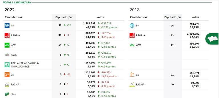 El PP obtiene más del doble de escaños en relación a las autonómicas de 2018 (cuando logró 26 diputados y el 20,8% de los votos). Los populares ganan ampliamente en las ocho provincias, con resultados históricos en tradicionales feudos socialistas como Sevilla, Jaén y Huelva. Y esto a un año vista de las elecciones municipales de 2023.