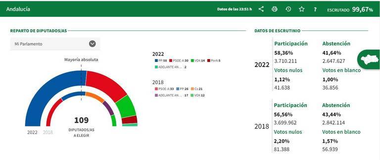 Andalucía se vuelve del PP, 58 diputados; 30 el PSOE, 14 de VOX y 7 de Por Andalucía y Adelante