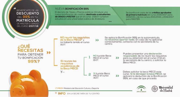 Esta bonificación consiste en que los alumnos universitarios sólo tendrán que pagar la matrícula completa durante su primer año de carrera. A partir de ese momento, tendrán bonificados tantos créditos como aprueben en el curso anterior de asignaturas matriculadas por primera vez. Esta medida afecta a todos los estudiantes matriculados en la UHU, tanto en estudios de Grado como en los Másteres Oficiales, no requiriéndose ningún otro requisito para su aplicación.