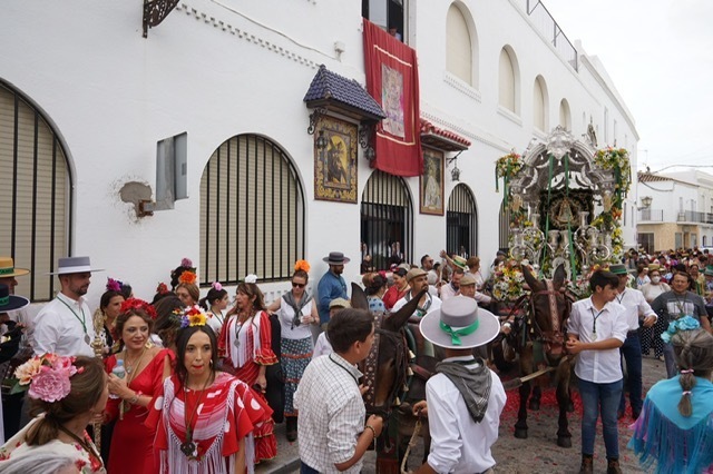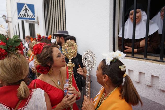 Al término de la santa misa, la carreta del Simpecado, acompañada por los peregrinos, ha iniciado su caminar, haciendo su primera parada en el Convento de las Hermanas de la Cruz. Seguidamente, la comitiva se ha detenido a las puertas del Ayuntamiento, donde ha sido recibida por las autoridades locales, que han hecho entrega a la presidenta, Carmen González, de un ramo de flores. A continuación, los peregrinos han recorrido las principales calles de la localidad, deteniéndose en los lugares habituales, como la Comandancia de Marina o el Cuartel de la Guardia Civil, entre otros, donde rezan cada año el Ángelus antes de partir. La primera edil, que ha acompañado a los romeros hasta su partida, ha deseado a los rocieros un buen camino y una feliz romería.