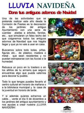 Los interesados en colaborar en la decoración de este espacio del pueblo pueden llevar los enseres al Centro Cultural en horario de mañana, o a la Biblioteca Municipal y a la Casa de la Juventud en horario de tarde. El 9 de diciembre se colgarán los adornos para formar la 'Lluvia Navideña'.