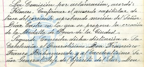 En aquella fecha y para conmemorar lo que el lenguaje de la Dictadura denominaba “segundo aniversario de la salvación material y espiritual de Huelva por las tropas invictas de nuestro ejército nacional” el Ayuntamiento creó la distinción de Medalla de Honor, un galardón que también se le concedió al Dictador Francisco Franco.