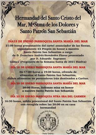 Y no es solo el Carnaval y San Sebastián en la capital. Porque Punta Umbría celebrará sus fiestas patronales de San Sebastián. Este sábado 15 de enero será el pregón en la parroquia de Santa María del Mar. Éste será el primer evento de las fiestas patronales que organiza anualmente la Hermandad del Santo Cristo del Mar, María Santísima de los Dolores y Santo Patrón San Sebastián.