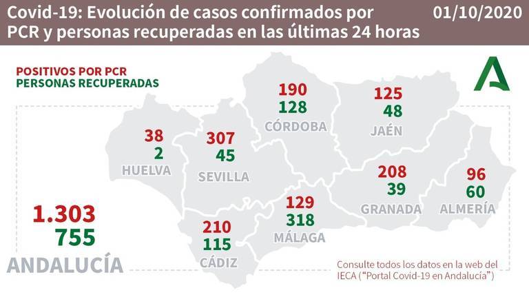 En el último día, la provincia onubense registra 38 positivos más (1.480 confirmados por pruebas PCR desde marzo) y 2 nuevas hospitalizaciones (19 actualmente, -ninguna en UCI- y 268 desde el inicio de la pandemia).