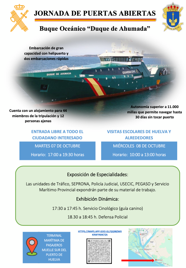 El Buque Oceánico “Duque de Ahumada” de la Guardia Civil abrirá sus puertas al público hoy día 7 y mañana 8 de octubre en el Muelle Sur del Puerto de Huelva (en el término municipal de Palos de la Frontera). La embarcación, de gran capacidad y equipada con helipuerto y dos embarcaciones rápidas, cuenta con alojamiento para 44 miembros de la tripulación y 12 personas ajenas, y una autonomía que le permite navegar hasta 30 días sin tocar puerto.