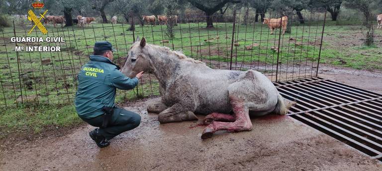 La Guardia Civil ha liberado a un caballo que se encontraba atrapado por una de sus patas. Los hechos se produjeron a finales del pasado mes, cuando en la Central de Servicios de la Guardia Civil (062) se recibió una llamada de un particular que alertaba de la presencia de un caballo en un camino de la localidad de Santa Olalla del Cala, el cual parecía atrapado y sangraba por una de sus patas.