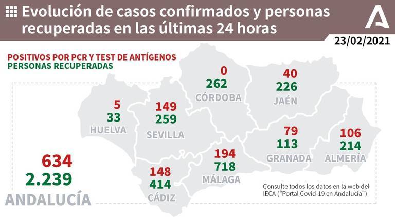 Además, la tasa de incidencia acumulada de Andalucía ha bajado este lunes a 259,0 casos por 100.000 habitantes en los últimos 14 días, que son 20,4 menos que la contabilizada este lunes (279,4) y 192,1 menos que el martes pasado (451,1).