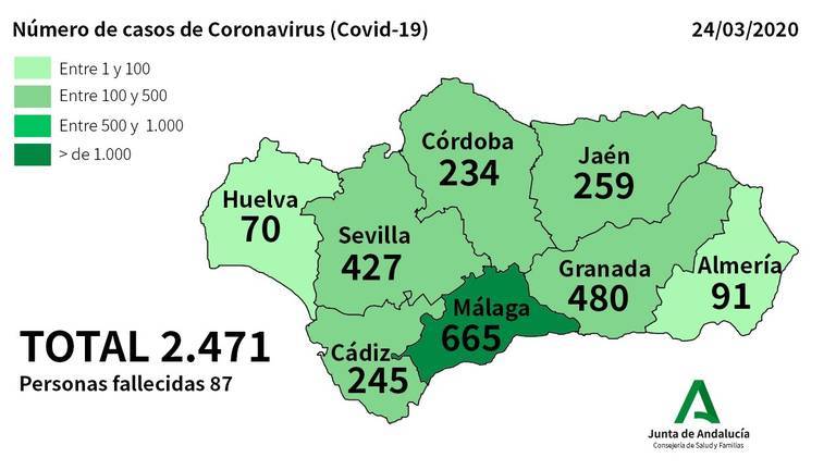 En Andalucía se contabilizan hasta el momento 2.471 personas contagiadas, de los que 87 han fallecido y 219 se han curado o tienen ya el alta hospitalaria. 1.132 permanecen ingresados, de los que 102 están en la UCI.