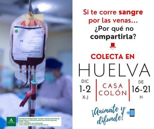 El Centro de Transfusión de Huelva ha convocado una nueva colecta de sangre para los días 1 y 2 de diciembre en la Casa Colón de la capital.