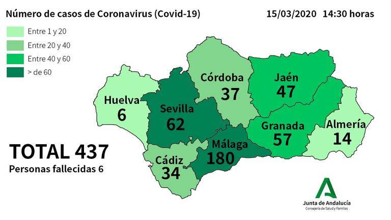 Andalucía ha registrado este domingo una sexta muerte por coronavirus (en Jaén) y el número de contagiados se eleva a 437, tras sumar 61 nuevos casos en las últimas horas, según los últimos datos de las 09,00 horas que ha ofrecido la Consejería de Salud y Familias.