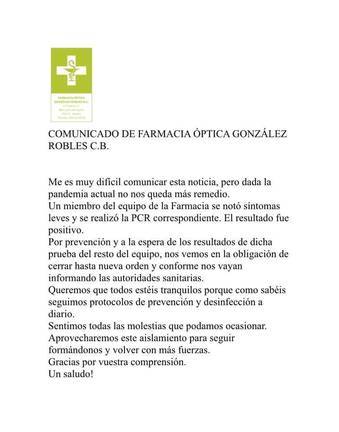 Tras los datos de ayer, la Farmacia González Robles de San Juan comunicaba a los vecinos que cerraba sus puertas tras detectarse un caso entre su personal. Ahora, el resto de trabajadores de la farmacia se hará las pruebas correspondiente. Mientras tanto, el establecimiento permanecerá cerrado al público.