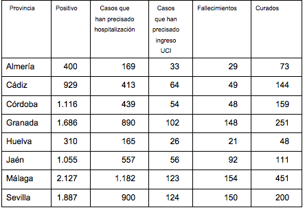 Andalucía alcanza ya los 9.510 afectados por coronavirus. Suma 513 positivos en 24 horas, según los datos difundidos a las 12.00 horas de este jueves por el Ministerio de Sanidad. Los fallecidos ascienden a 691 (86 más que el jueves). Esta es la cifra más alta de muertes en 24 horas desde el inicio de la pandemia.