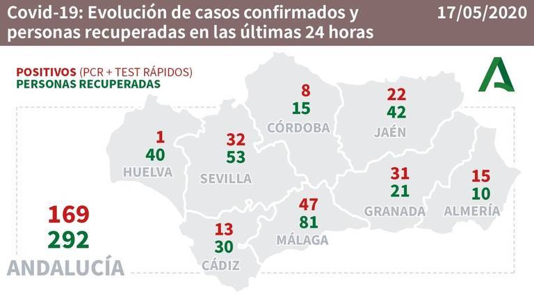 Andalucía suma 16.432 casos positivos desde el inicio de la pandemia, superando así la previsión del Plan ).000 primero y del Plan 15.000, ahora. Tiene 12.450 confirmados por PCR y 3.982 asintomáticos, lo que supone 169 más en 24 horas. El crecimiento sigue mayoritariamente concentrado en los asintomáticos, aunque el aumento diario de contagios confirmados mediante PCR es de 30 casos -aumento del 0,24% en tasa diaria-, cifra notablemente superior a la del sábado con 19.