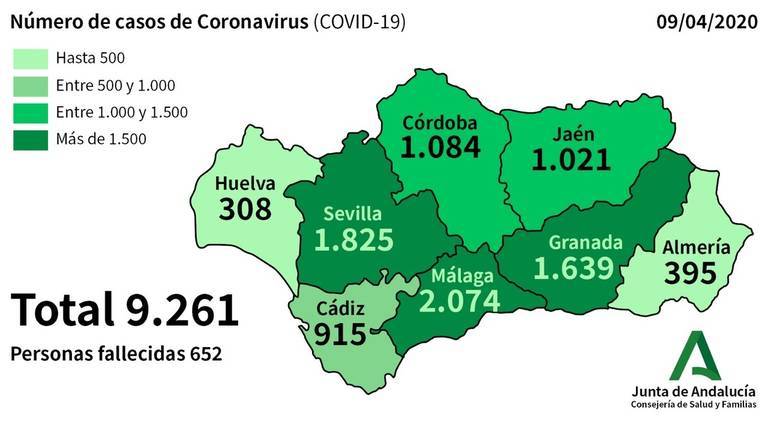 Andalucía alcanza ya los 9.261 afectados por coronavirus. Suma 264 positivos en 24 horas, según los datos difundidos a las 12.30 horas de este jueves por el Ministerio de Sanidad. Actualmente, 1.989 pacientes confirmados con COVID-19 permanecen ingresados en los hospitales andaluces, de los que 406 se encuentran en UCI. Los fallecidos ascienden a 652.