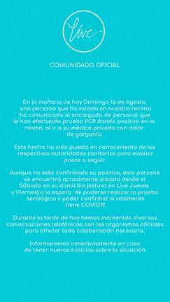 La Live ha confirmado que tiene recogidos los datos de los clientes y localizado las zonas que compartieron con la persona que finalmente ha resultado positivo en Covid-19.
