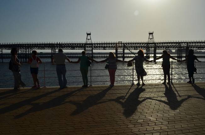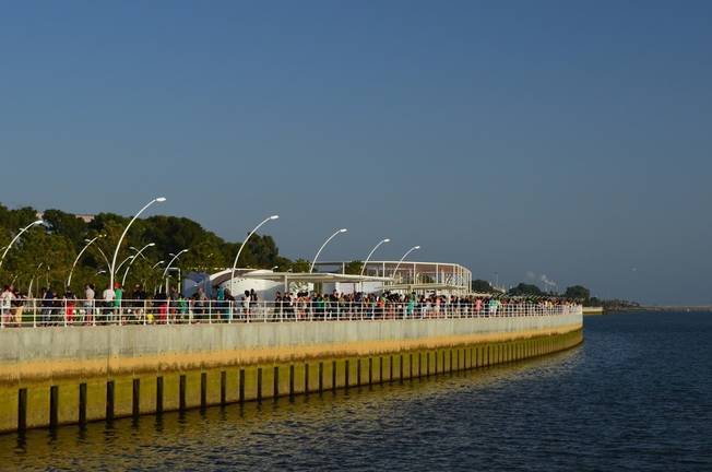 Numerosos onubenses se han concentrado esta tarde en el Paseo de la Ría para formar una cadena humana que sirva como ola solidaria y medida de protesta por el reciente incendio en el entorno de Doñana que "ha puesto de manifiesto la vulnerabilidad del patrimonio natural de Huelva".