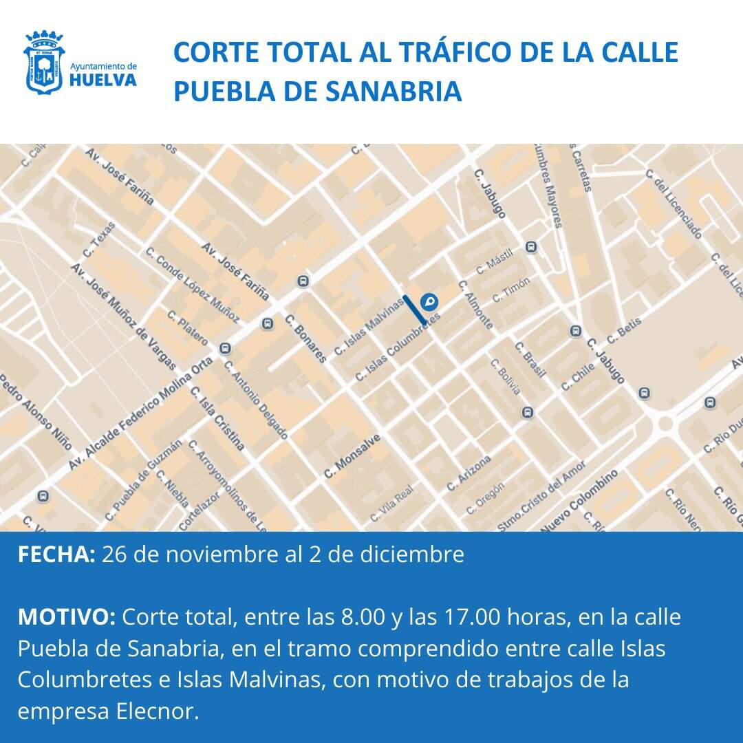 El tráfico en la calle Puebla de Sanabria quedará cortado de manera total desde el 26 de noviembre hasta el 2 de diciembre de 2025, en horario de 8:00 a 17:00 horas, debido a trabajos realizados por la empresa Elecnor, según ha informado el Ayuntamiento de Huelva.