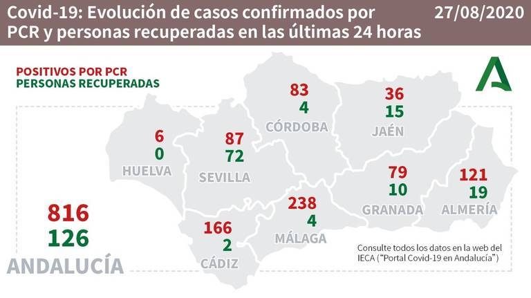 Mientras, Andalucía ha registrado este jueves un incremento de 816 nuevos casos de Covid-19 confirmados por PCR, segunda cifra más alta desde el pasado 30 de marzo, según los datos publicados por el Instituto de Estadística y Cartografía de Andalucía (IECA).
