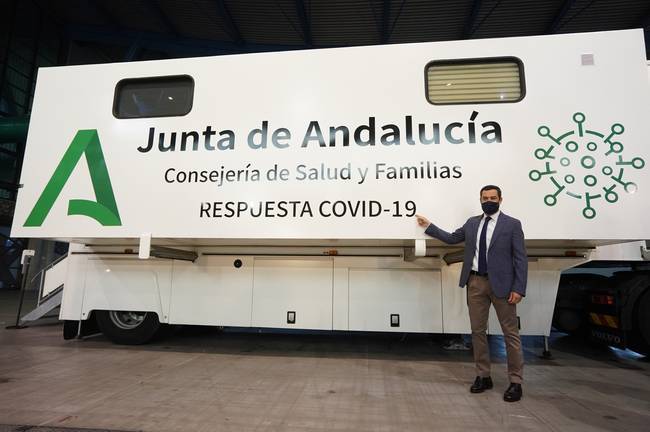 El presidente de la Junta de Andalucía, Juanma Moreno, ha dado a conocer las unidades móviles para cribados masivos que recorrerán todas las provincias andaluzas a partir del lunes y en un plazo estimado de seis meses. En total, serán ocho vehículos y cada uno tiene la capacidad de realizar unas 700 pruebas diarias, por lo que, se calcula que entre todos se puedan alcanzar más de 5.000 al día.