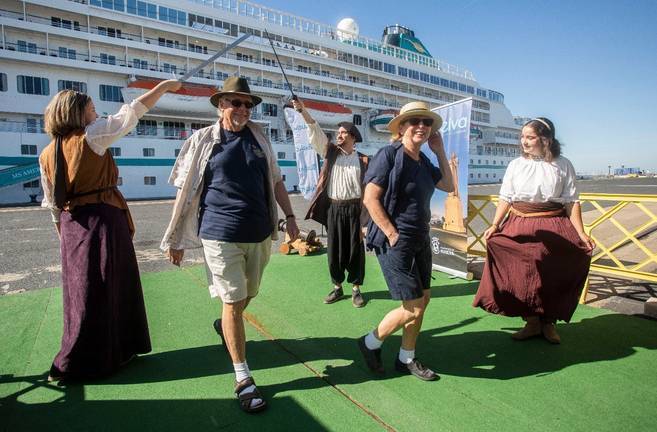El grupo de animación Almadraba ha dado la bienvenida a los cruceristas, que han contado con un servicio de autobuses para su traslado desde el Muelle Sur hasta la Casa Colón en el centro de la ciudad, lugar donde han degustado vinos de D.O. servidos por una venenciadora. A lo largo de la jornada, 275 pasajeros realizan diferentes excursiones a El Rocío, Ciudad de Huelva, Tren del vino y La Rábida - Lugares Colombinos.