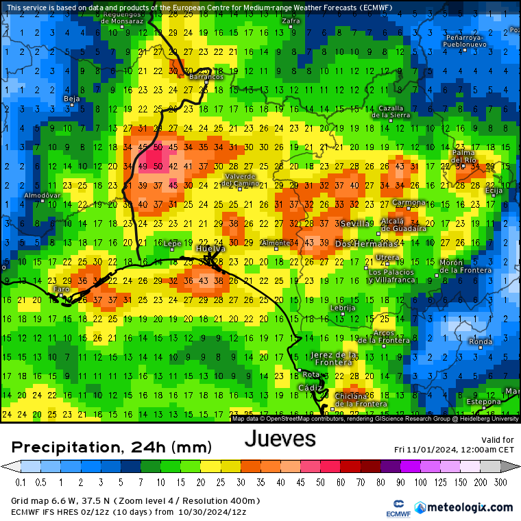 Hay zonas en las que esperan acumulados de hasta 50 litros por m2 en pocas horas, especialmente en zonas limítrofes con Portugal.