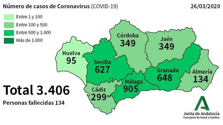 Andalucía alcanza ya los 3.406 afectados por coronavirus, 396 más que este miércoles, un 13% más en 24 horas. Los fallecidos en la comunidad autónoma ascienden a 134, 21 más, aunque la cifra es menor que en las dos jornadas anteriores.