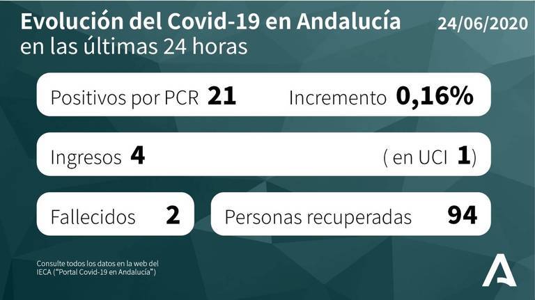 Los datos del coronavirus en Andalucía hasta hoy, miércoles 24 de junio, acumulan ya 12.895 casos positivos de Covid-19, 1 en las últimas 24 horas.