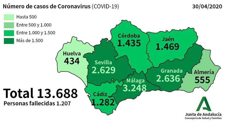 Andalucía alcanza los 1.207 fallecidos por coronavirus, 19 más en 24 horas. Los hospitalizados suman un total de 5.874, 42 más, mientras que no hay ningún nuevo ingreso en Unidades de Cuidados Intensivos (UCI).