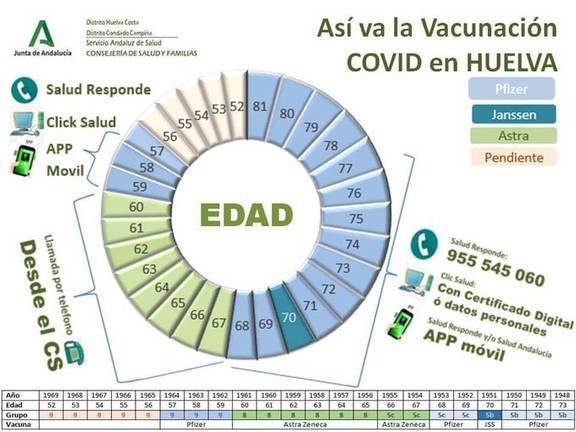 En la actualidad se encuentra en curso la vacunación de la población de 70 a 79 años de edad, de 66 a 69 y de 60 a 65 (grupos de priorización 5B, 5C y 8, respectivamente), y se acaba de incorporar la de 50 a 59 años (grupo 9), empezando por la de mayor edad y continuando en sentido descendente. También están recibiendo las dosis los pacientes considerados vulnerables o de muy alto riesgo en la estrategia nacional consensuada por el Consejo Interterritorial del Sistema Nacional de Salud (grupo 7).