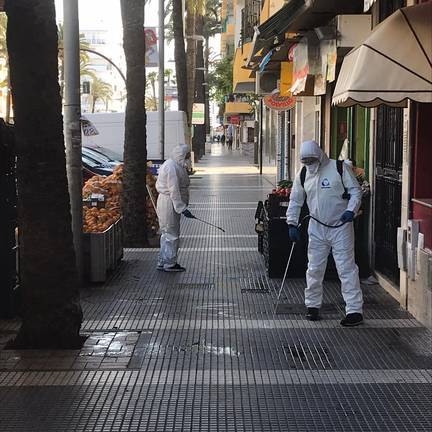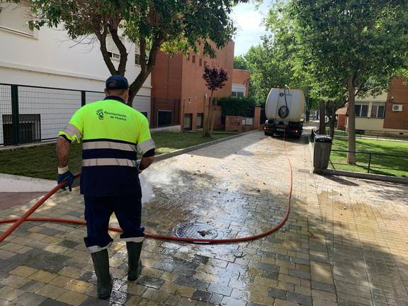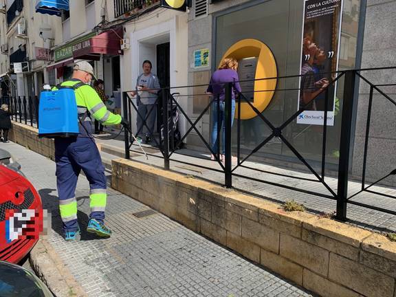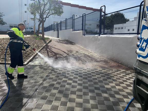 En todas las barriadas se repasan diariamente con máquinas baldeadoras o camiones cisternas, los espacios públicos y el entorno de los centros de salud, farmacias, supermercados, estancos, kioscos o empresas que mantienen la atención al público.