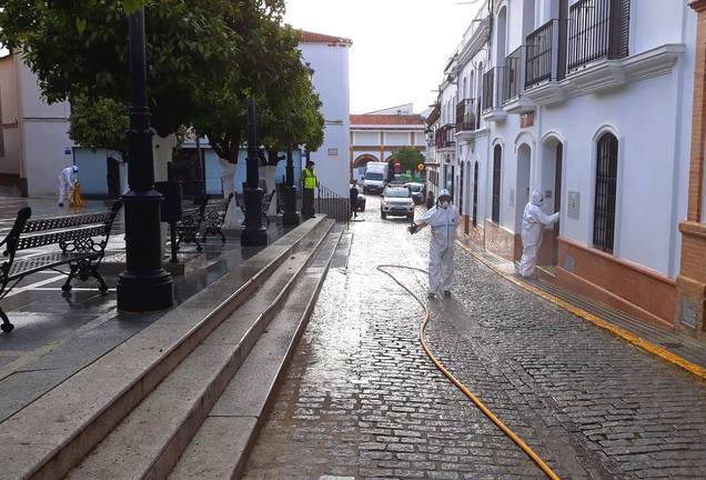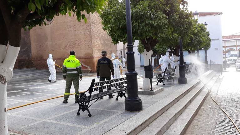 El viernes efectivos del Infoca desinfectaron con hipoclorito sódico mezclado con agua las localidades de Punta Umbría, Ayamonte, San Bartolomé de la Torre e Hinojos.