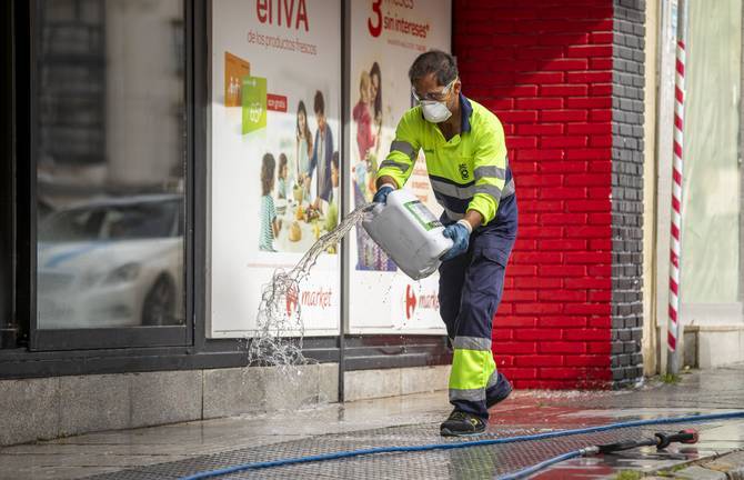 Si habitualmente el Servicio Municipal de Limpieza emplea máquinas de barrido automático que recorren las calles y avenidas de la capital, en estos días los operarios están reforzando su labor utilizando para ello agua a presión y desinfectante que utilizan de forma manual para llegar a todos los recovecos posibles y puntos más vulnerables, tanto por la mañana, como por la tarde y noche.