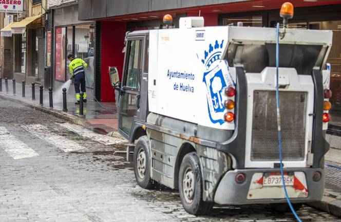 El Ayuntamiento de Huelva está dedicando desde el pasado sábado, jornada en la que fue declarada el Estado de Alarma por el Covid-19, todos sus esfuerzos a la limpieza y desinfección de la ciudad. Para ello, ha puesto en marcha un protocolo especial y extraordinario de actuación que incluye la movilización diaria de 150 profesionales, que emplean para esta minuciosa tarea un total de 160.000 litros de agua y 100 litros de desinfectante.
