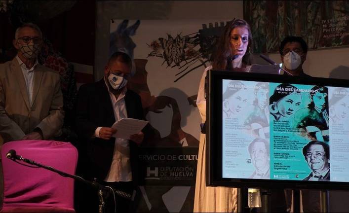 El programa ha comenzado con la lectura de la Declaración Institucional ratificada por el Pleno de la Diputación el pasado 4 de junio por parte de Argentina y Jeromo Segura, a quien se ha sumado Rocío Márquez a través de un vídeo, y que ha sido respaldada con la presencia de Arcángel. A continuación, Juan Camacho ha impartido la conferencia y presentación de su libro "Y sin Huelva no hay fandango", con Antonio Dovao a la guitarra y Elena Bellido al cante.